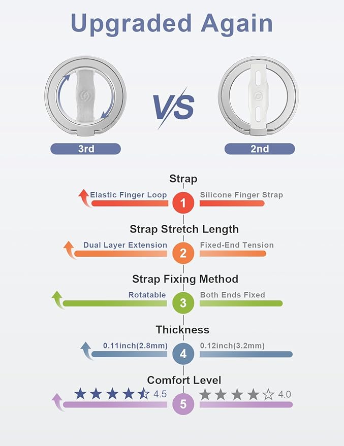 - Comfortable Elastic Phone Grip: This strap features a more comfortable and highly stretchable, high-elastic strap. With its extended length, it greatly reduces the pressure on the fingers when using the strap. The strap is fixed on a rotatable inner ring, allowing you to easily adjust your phone to the most comfortable angle while using the grip.