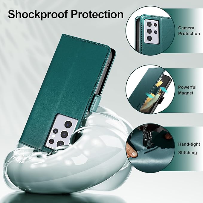 Wallet Flip Case for Samsung Galaxy S21 Ultra 5G - [RFID Blocking] Luxury PU Leather Card Holder Magnetic Phone Cover with Kickstand,Shockproof Protective Case,Green