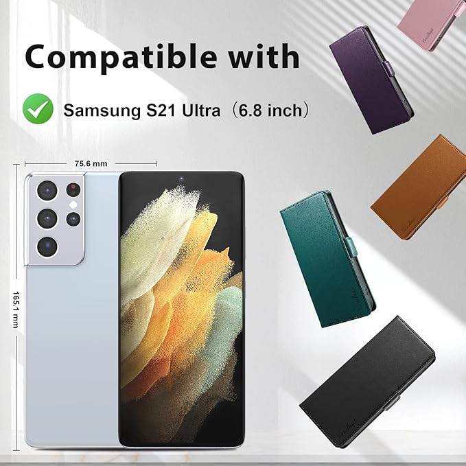 - 【Compatible with Samsung Galaxy S21 Ultra 5G】:This Leather wallet case fits perfectly on the corresponding phone's sensors, buttons and camera. Sensitive keys, smooth fingerprint unlock, clear earpiece. Please make sure your phone is Samsung Galaxy S21 Ultra 5G before purchase.