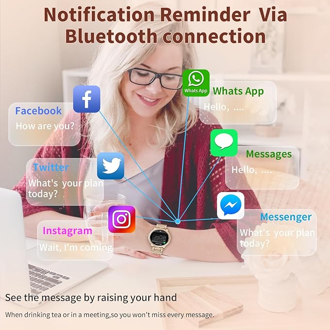 - Back to Wrist Communication:Women smart watch with high-definition speaker and microphones,step counter running watch can be directly used women smart watch to make/answer calls,read text messages,store contact and view recent call records,When there is an incoming text or social media messages, it will also vibrate to remind you to check out,(vibration or silent mode),Never miss anything important even on the go. (you cannot send messages or texts back)