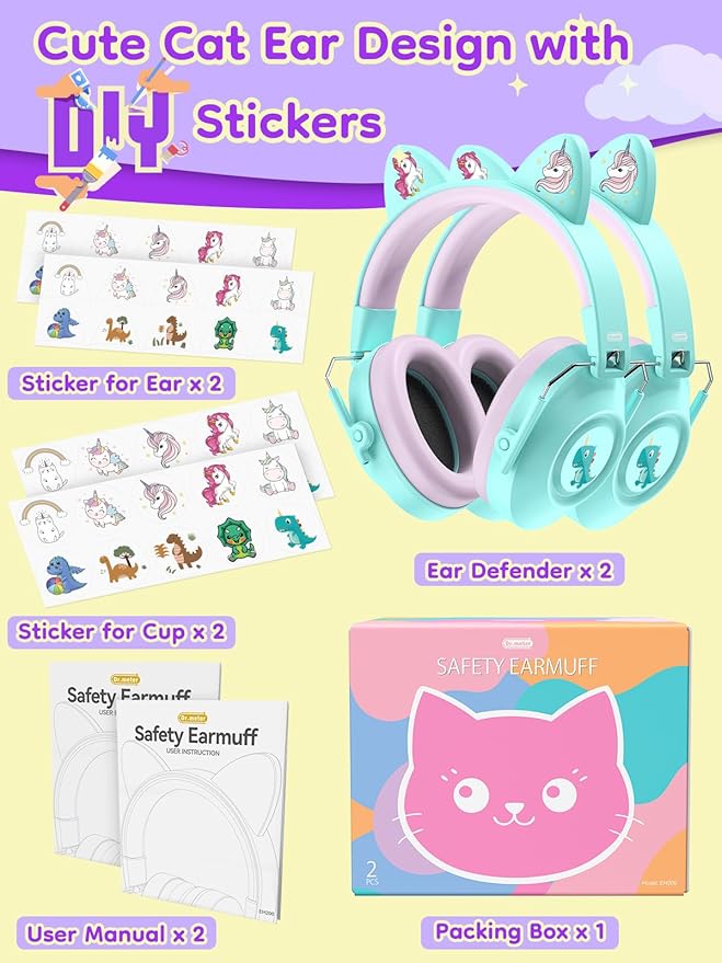 - 【Adjustable Headband & DIY Fun】: The cute cat ear noise cancelling headphone for kids' adjustable headband accommodates toddlers, children, teenagers, as well as adults. The package includes 2 stickers for personalization, letting your child’s creativity shine while ensuring comfort and full protection! Tips: If too tight, place it on a size 3 soccer ball for 4 hours to loosen.