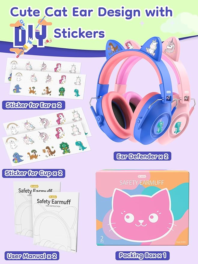 - 【Adjustable Headband & DIY Fun】: The cute cat ear noise cancelling headphone for kids' adjustable headband accommodates toddlers, children, teenagers, as well as adults. The package includes 2 stickers for personalization, letting your child’s creativity shine while ensuring comfort and full protection! Tips: If too tight, place it on a size 3 soccer ball for 4 hours to loosen.