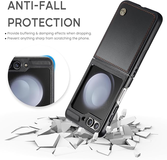 - [Fully Protection] This case is made from premium PU leather, providing a comfortable hand feeling and a great impression. The Samsung Galaxy Z Flip 5 leather case covers all corners and provides great dual-layer protection to your smartphone. There are raised bezels around the screen and camera protect your Samsung Z Flip5 from daily scratches.