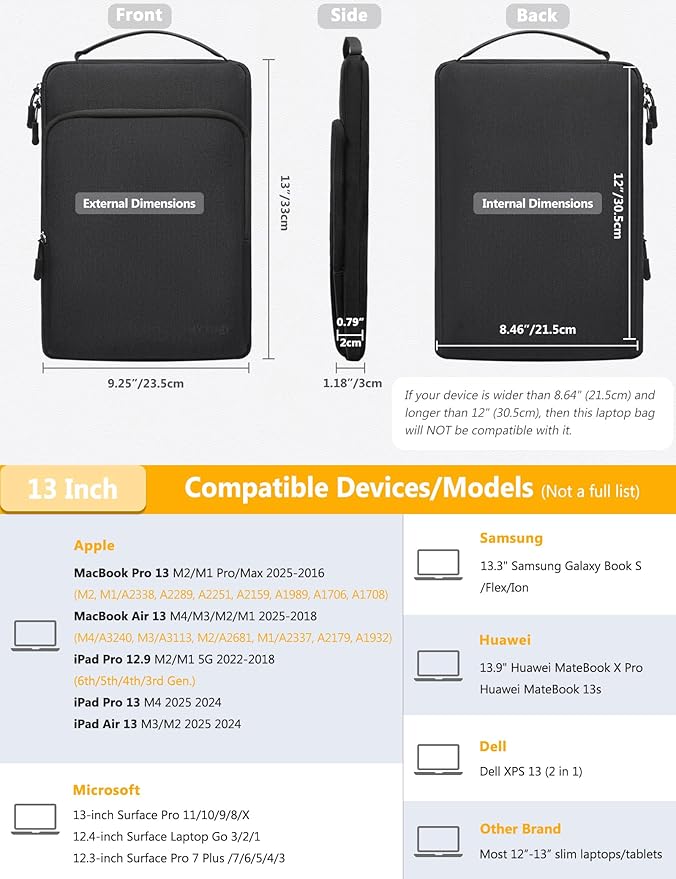 - Internal Dimensions: 12" x 8.46" x 0.79". Compatible with MacBook Air 13 M4/M3/M2/M1 2025-2018 (A3240, A3113, A2681, A2337, A2179, A1932), MacBook Pro 13 M2/M1 Pro/Max 2025-2016 (A2338, A2289, A2251, A2159, A1989, A1706, A1708), iPad Pro 13 M4 & iPad Air 13 M3/M2 2025 2024, iPad Pro 12.9 2022-2018, 13"-12.3" Surface Pro, 12.4" Surface Laptop Go, Dell XPS 13, 13.9" Huawei MateBook X Pro, Huawei MateBook 13s, 13.3" Samsung Galaxy Book S/Flex/Ion, and most 12"-13" slim laptops/tablets, etc.