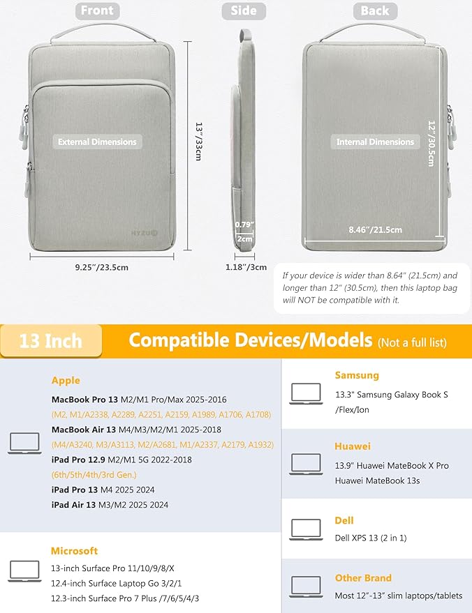 - Internal Dimensions: 12" x 8.46" x 0.79". Compatible with MacBook Air 13 M4/M3/M2/M1 2025-2018 (A3240, A3113, A2681, A2337, A2179, A1932), MacBook Pro 13 M2/M1 Pro/Max 2025-2016 (A2338, A2289, A2251, A2159, A1989, A1706, A1708), iPad Pro 13 M4 & iPad Air 13 M3/M2 2025 2024, iPad Pro 12.9 2022-2018, 13"-12.3" Surface Pro, 12.4" Surface Laptop Go, Dell XPS 13, 13.9" Huawei MateBook X Pro, Huawei MateBook 13s, 13.3" Samsung Galaxy Book S/Flex/Ion, and most 12"-13" slim laptops/tablets, etc.