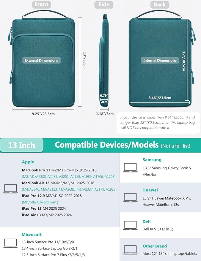 - Internal Dimensions: 12" x 8.46" x 0.79". Compatible with MacBook Air 13 M4/M3/M2/M1 2025-2018 (A3240, A3113, A2681, A2337, A2179, A1932), MacBook Pro 13 M2/M1 Pro/Max 2025-2016 (A2338, A2289, A2251, A2159, A1989, A1706, A1708), iPad Pro 13 M4 & iPad Air 13 M3/M2 2025 2024, iPad Pro 12.9 2022-2018, 13"-12.3" Surface Pro, 12.4" Surface Laptop Go, Dell XPS 13, 13.9" Huawei MateBook X Pro, Huawei MateBook 13s, 13.3" Samsung Galaxy Book S/Flex/Ion, and most 12"-13" slim laptops/tablets, etc.