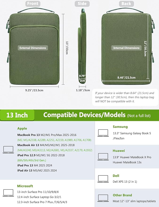 - Internal Dimensions: 12" x 8.46" x 0.79". Compatible with MacBook Air 13 M4/M3/M2/M1 2025-2018 (A3240, A3113, A2681, A2337, A2179, A1932), MacBook Pro 13 M2/M1 Pro/Max 2025-2016 (A2338, A2289, A2251, A2159, A1989, A1706, A1708), iPad Pro 13 M4 & iPad Air 13 M3/M2 2025 2024, iPad Pro 12.9 2022-2018, 13"-12.3" Surface Pro, 12.4" Surface Laptop Go, Dell XPS 13, 13.9" Huawei MateBook X Pro, Huawei MateBook 13s, 13.3" Samsung Galaxy Book S/Flex/Ion, and most 12"-13" slim laptops/tablets, etc.