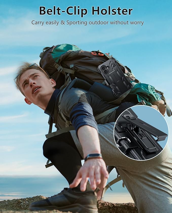 - 360 Rotatable Belt-Clip Holster: This clip-on full coverage armour holster can hold your cellphone securely, easy release and encase iphone16 back and hold in. You can use it as a backup protection or clip it on pants belt, backpack strap or else. Provides all round protection for your mobile phone case in all activities,especially when working outdoors,doing sports,camping,traveling