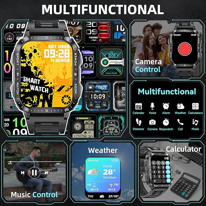- [Multifunctional]: Rugged smartwatch is waterproof, which allows you to use it in daily life and outdoor sports with confidence. In addition, smart watch for iPhone compatible also provides a variety of practical functions, such as flashlight, music control, remote photo, flip wrist bright screen, stopwatch, do not disturb mode and other various functions, which can meet your diversified needs and suitable for birthday and Christmas gifts for friends and family!