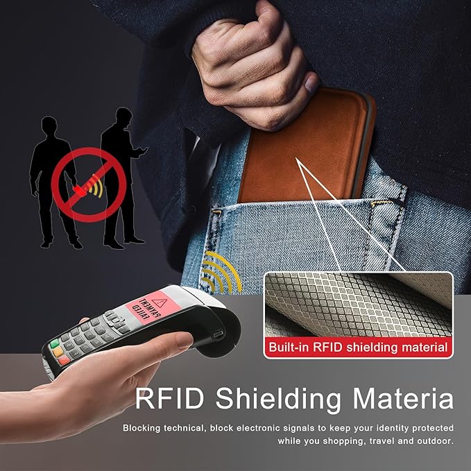 - [Credit Card Anti-Theft Swipe Function]---This RFID Blocking leather wallet case is designed to protect your card information.The RFID Shielding Technology to block unauthorized access.Many cards,including credit,debit and ID cards,contain an RFID chip.(This chip can be read by an RFID reader from up to 10 feet(about 3 meters) away, without any physical contact.)