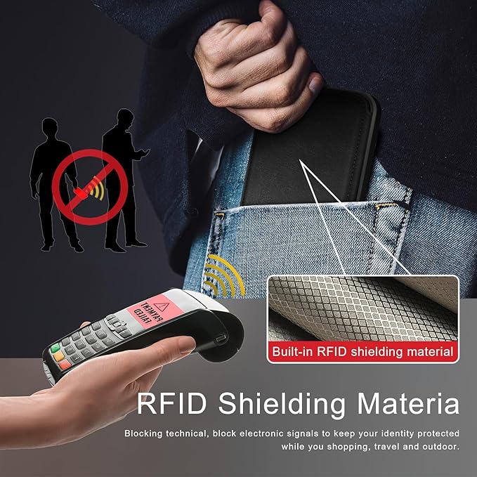 - [Credit Card Anti-Theft Swipe Function]---This RFID Blocking leather wallet case is designed to protect your card information.The RFID Shielding Technology to block unauthorized access.Many cards,including credit,debit and ID cards,contain an RFID chip.(This chip can be read by an RFID reader from up to 10 feet(about 3 meters) away, without any physical contact.)