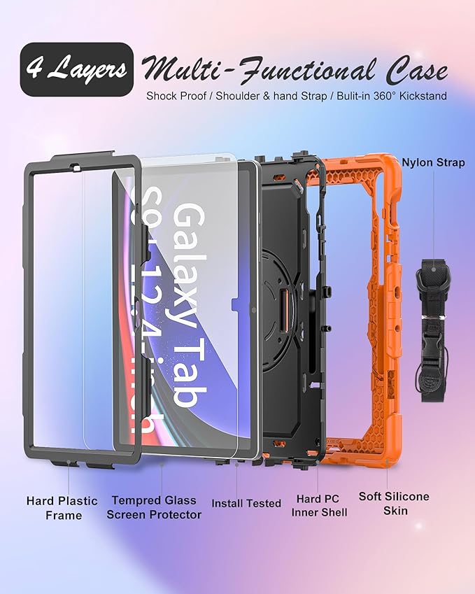 - Tempered Glass Screen Protector: The Tab S10 Plus/ S9 FE Plus/ S9 Plus 12.4” Shockproof Case for Samsung Galaxy come with a 9H hardness tempered glass screen protector to provide more comprehensive protection for the device. The HD screen protector is scratch-resistant, fingerprint-proof, sensitive to touch, easy to install and durable, and can be used with Stylus S-Pen. If your Tab S10+/ S9 FE+/ S9+ Tablet needs a full set of protective equipment, then they are a good choice