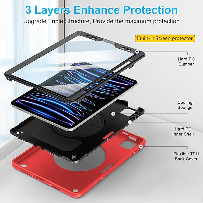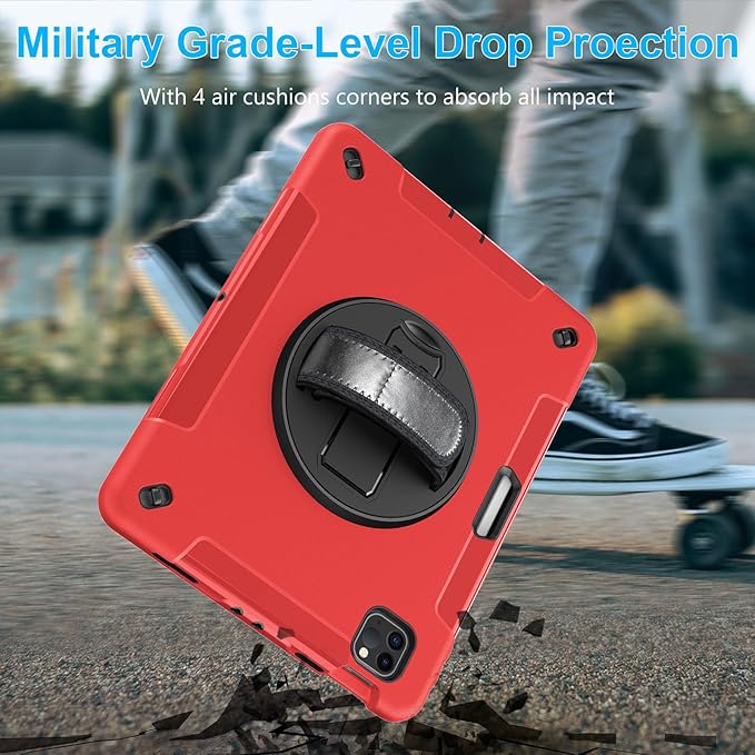 Case for iPad Pro 11 Inch 2022/2021/ 2020/2018: Cover for iPad 11 Inch 4th/ 3rd/ 2nd/ 1st Generation with Screen Protector- Stand- Handle- Shoulder Strap- Pencil Holder Red