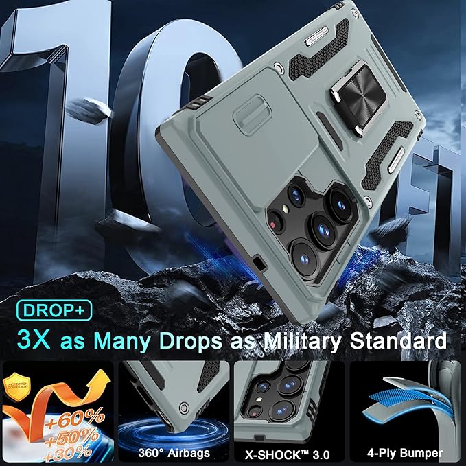 DEERLAMN Case for Samsung Galaxy S25 Ultra with Slide Camera Cover+Screen Protector (1 Pack), Rotated Ring Kickstand Military Grade Shockproof Protective Cover-Grey