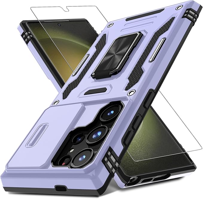 DEERLAMN Case for Samsung Galaxy S25 Ultra with Slide Camera Cover+Screen Protector (1 Pack), Rotated Ring Kickstand Military Grade Shockproof Protective Cover-Light Purple