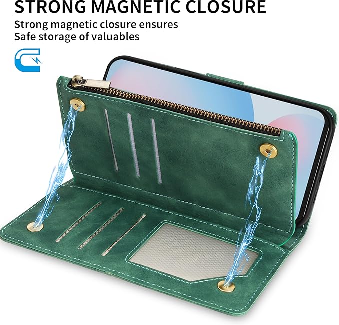ZZXX for Samsung Galaxy S24 FE Wallet Case with RFID Blocking Card Slot PU Leather Zipper Flip Folio with Strap Kickstand Protective Cover for Samsung Galaxy S24 FE Case Wallet(Green-6.7 inch)