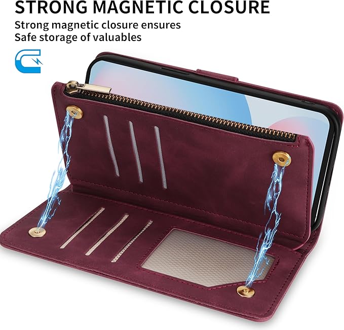 ZZXX for Samsung Galaxy S24 FE Wallet Case with RFID Blocking Card Slot PU Leather Zipper Flip Folio with Strap Kickstand Protective Cover for Galaxy S24 FE Case Wallet(Wine Red-6.7 inch)