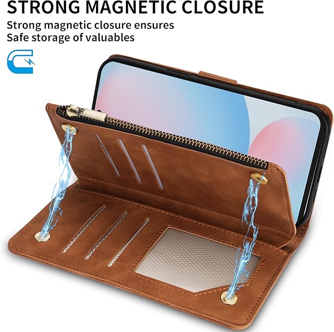 ZZXX for Samsung Galaxy S24 FE Wallet Case with RFID Blocking Card Slot PU Leather Zipper Flip Folio with Strap Kickstand Protective Cover for Samsung Galaxy S24 FE Case Wallet(Brown-6.7 inch)