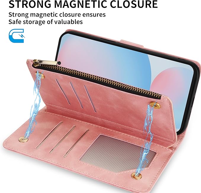ZZXX for Samsung Galaxy S24 FE Wallet Case with RFID Blocking Card Slot PU Leather Zipper Flip Folio with Strap Kickstand Protective Cover for Samsung Galaxy S24 FE Case Wallet(Pink-6.7 inch)