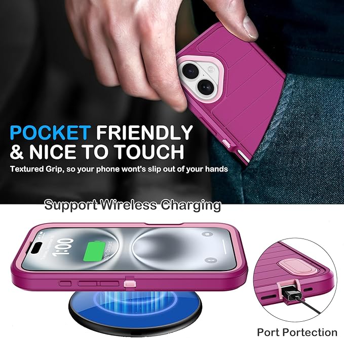 - [2X HD SCREEN PROTECTORS] Our iPhone 16 case is not only stylish but also highly protective. It features a touch-sensitive screen protector to keep your screen scratch and crack-free. The raised bezels provide extra protection against drops, cracks, and scratches, lifting the screen and camera off flat surfaces. We have also included charging port covers to keep out dirt and debris, making our rugged case dustproof. Ensuring optimal protection for your iPhone 16.