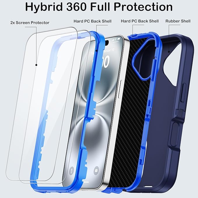 - [2X HD SCREEN PROTECTORS] Our iPhone 16 case is not only stylish but also highly protective. It features a touch-sensitive screen protector to keep your screen scratch and crack-free. The raised bezels provide extra protection against drops, cracks, and scratches, lifting the screen and camera off flat surfaces. We have also included charging port covers to keep out dirt and debris, making our rugged case dustproof. Ensuring optimal protection for your iPhone 16.