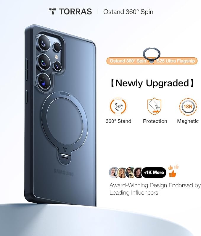 - 【Pioneering 360° Spin Stand】 This phone case for Samsung Galaxy S25 Ultra with stand offers a wider and more flexible adjustment angle: Place it in landscape mode for watching movies, adjustable to prevent screen glare. Switch to portrait mode with a unique angle up to 90°, and it can stand perfectly vertical for timer photos, like a mini tripod. No matter how high or low your desk is, just spin it boldly to achieve any of your viewing angles! Undergoing 30,000 rotation tests, the spinning stand has a longer service life than ever before