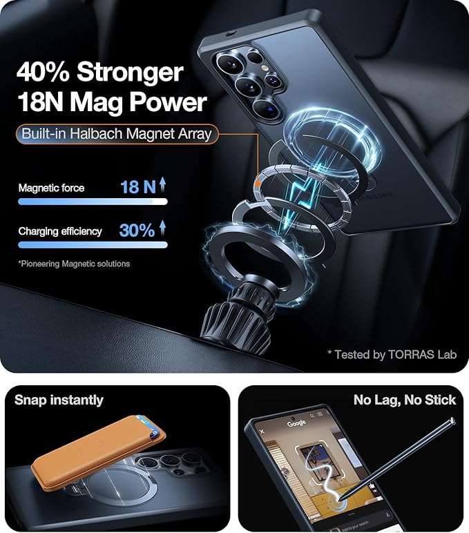 - 【18N Powerfully Magnetic】 Even on uneven terrain, it remains securely attached without dislodging from your car/bike mounts, not to mention daily use with magnetic accessories – all check! Employing exclusive Halbach-Mag technology, it boasts 40% stronger magnetic force (18N) than official cases for S25 ultra magnetic case