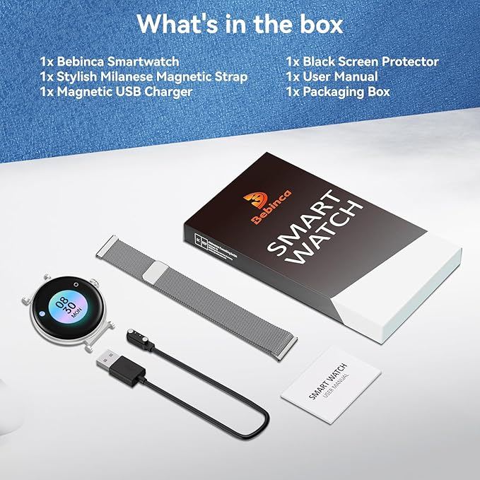 - Stylish Magnetic Milanese Band:The Bebinca women's smartwatch features a Magnetic Milanese Stainless Steel Mesh Band that combines elegance with comfort. Crafted from soft and lightweight mesh metal, the strap offers a waterproof and breathable design, ensuring all-day comfort without compromising style. The strong magnetic clasp provides a secure fit while allowing easy adjustments for the perfect look. Available in Rose Gold and Silver, it effortlessly complements your style for any occasion.
