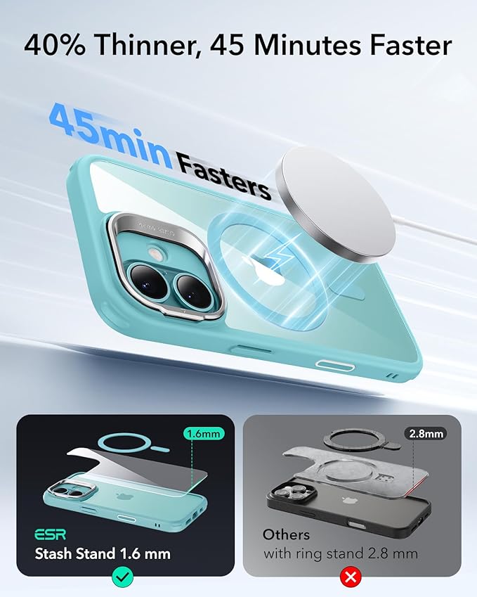 - Adjustable Stash Stand: positioned around camera frame to stay hidden when folded away while keeping MagSafe ring 100% unobstructed