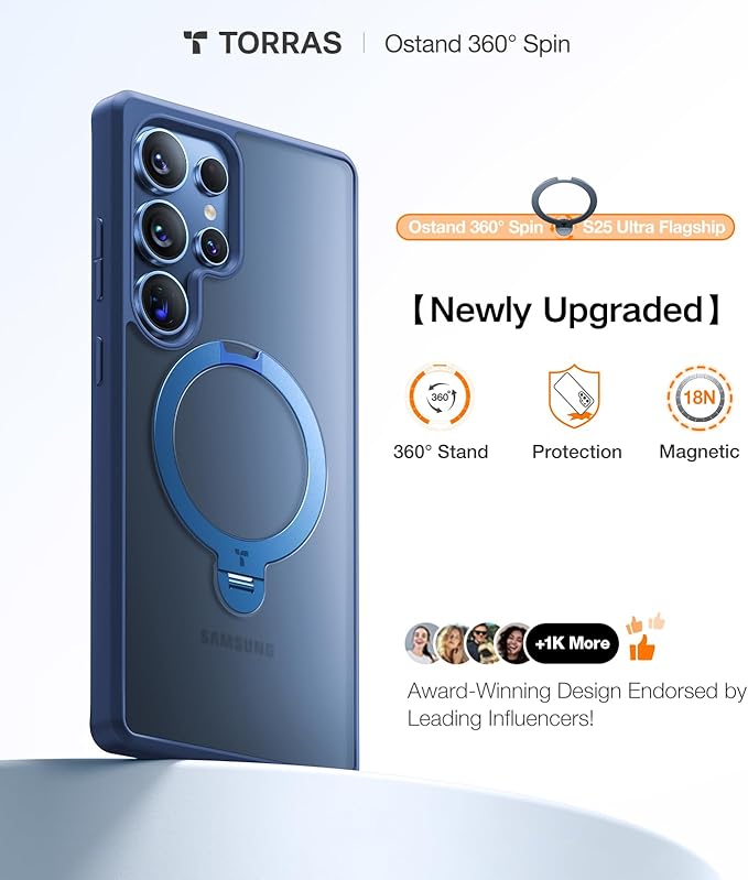 TORRAS 360° Spin Magnetic Stand for Samsung Galaxy S25 Ultra Case, Fit for Magsafe, Mil-STD Slim Protective S25 Ultra Case with Kickstand Rotatable, Aesthetic for Women Men, Ostand Spin, Navy Blue
