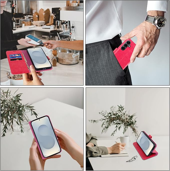 - All-around Protection: This Samsung S25 wallet case consists of a premium leather outer shell and a TPU inner shell. The outer leather has a luxurious and natural texture that is comfortable to the touch and protects against scratches and fingerprints. The soft and durable TPU inner shell with raised edges and cushioning design provides all-around protection for your phone, even if it is dropped from a high place without any damage.