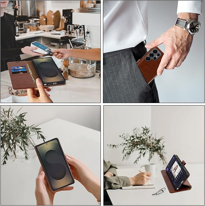 - All-around Protection: This Samsung S25 Ultra wallet case consists of a premium leather outer shell and a TPU inner shell. The outer leather has a luxurious and natural texture that is comfortable to the touch and protects against scratches and fingerprints. The soft and durable TPU inner shell with raised edges and cushioning design provides all-around protection for your phone, even if it is dropped from a high place without any damage.