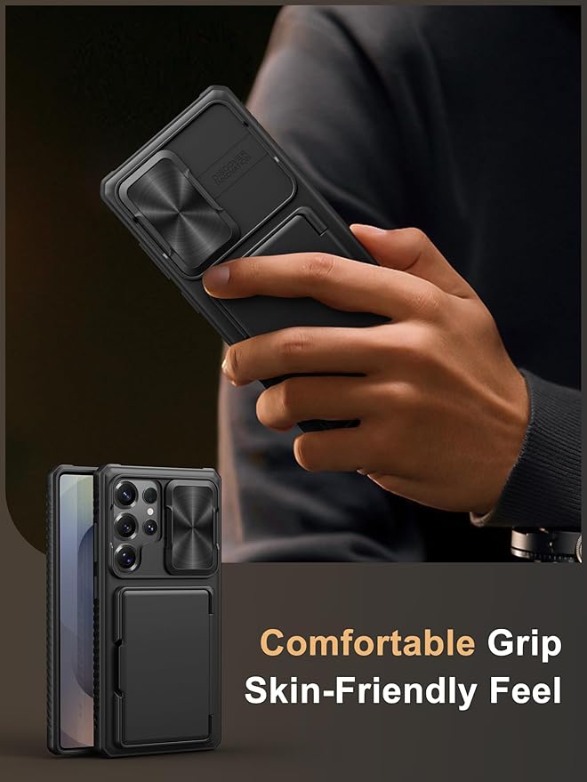 - 【Wallet-Card Holder-Storage】Our Galaxy S25 Ultra case has a storage space on the back design. You can safely store a small amount of cash or 4-5 cards according to the thickness of the card so that you can carry your credit cards, ID or a little cash when you're on the go, without a bulky wallet. With newly upgraded structures, the card holder hinge position is locked in the center of the phone case, refusing to fall off, which is more secure protection for your cards and cash
