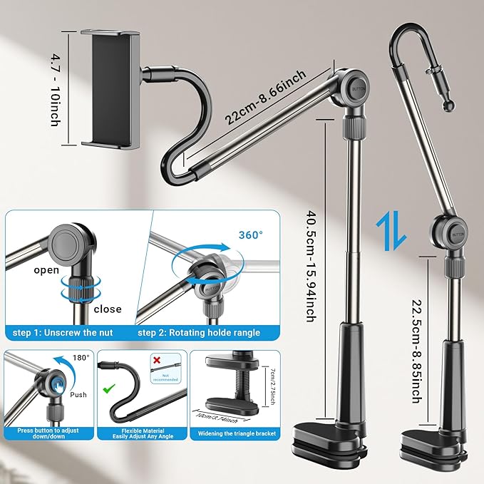 - 【Longer Arm&Sturdy】Holder is made of aluminum alloy, more sturdy and durable, just unscrew the nut, Max stretchable height/length of 15.9in/40.5cm, can be clamped on the bedside, table , office, desk and kitchen. Although it is longer, the thickened arm is also Sturdy