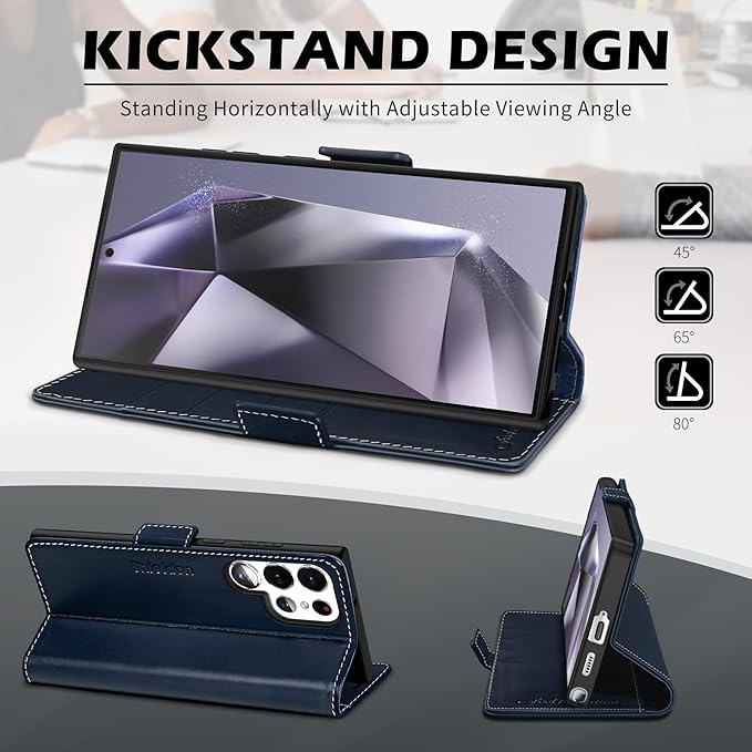 SHIELDON Case for Galaxy S25 Ultra 6.9", Genuine Leather Wallet Flip Book RFID Blocking Card Holder Kickstand Shock Absorbing Protective Case Compatible with Galaxy S25 Ultra - Retro Dark Blue