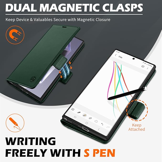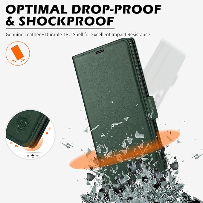 SHIELDON Case for Galaxy S25 Ultra 6.9", Genuine Leather Wallet Case with RFID Blocking Card Holder Kickstand Shock Absorbing Protective Cover Compatible with Galaxy S25 Ultra 2025 - Nappa Evergreen