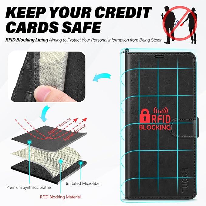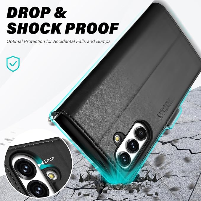 TUCCH Wallet Case for Galaxy S25 Plus with [Wrist Strap] TPU Shockproof Interior Case [RFID Blocking] Stand Card Slot, Magnetic PU Leather Cover Compatible with Galaxy S25 Plus, Black with Wristlet