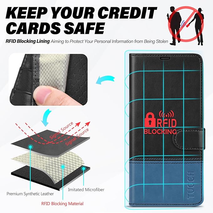 TUCCH Wallet Case for Galaxy S25, Magnetic PU Leather Stand [RFID Blocking] Credit Card Holder Flip Cover with [TPU Shockproof Interior Case] Compatible with Galaxy S25 6.2" 2025, Black & Light Blue