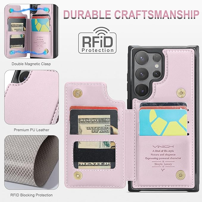 Vinich for Samsung Galaxy S25 Ultra Wallet Case with Card Holder, RFID Blocking Credit Slots Kickstand Shockproof Phone Cover for Women Men, Pink
