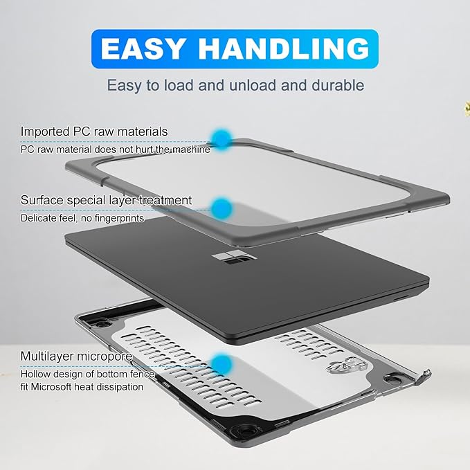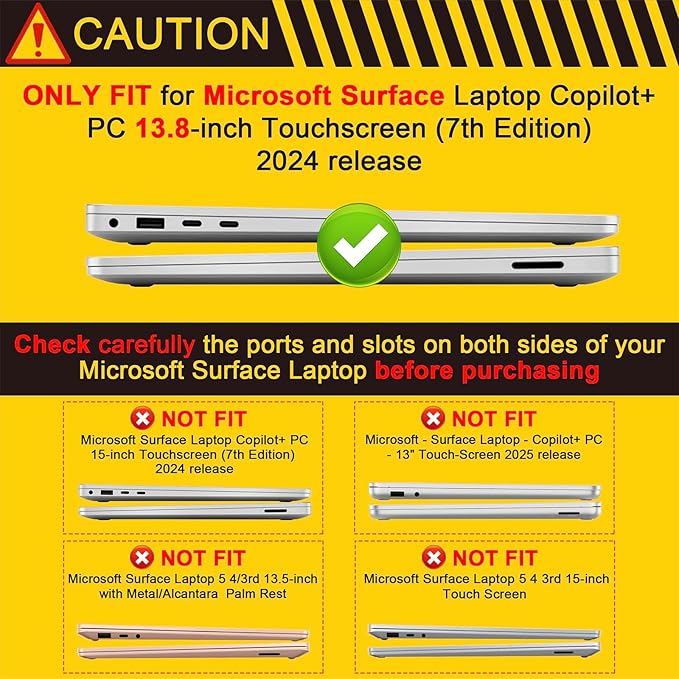 - Case specificity model:Case Only fit for Microsoft Surface Laptop Copilot+ PC 13.8-inch Touchscreen (7th Edition) 2024 release,Model number:2036.Note: different models correspond to different case,not compatible with 13.5" and 15" Microfoft surface laptop