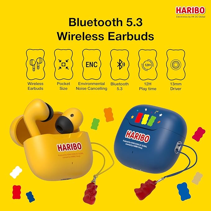Haribo Wireless Earbuds, Bluetooth 5.3 TWS, 13mm Bass Driver, ENC Noise Reduction, IPX4, USB-C Charging, Gummy Bear Style