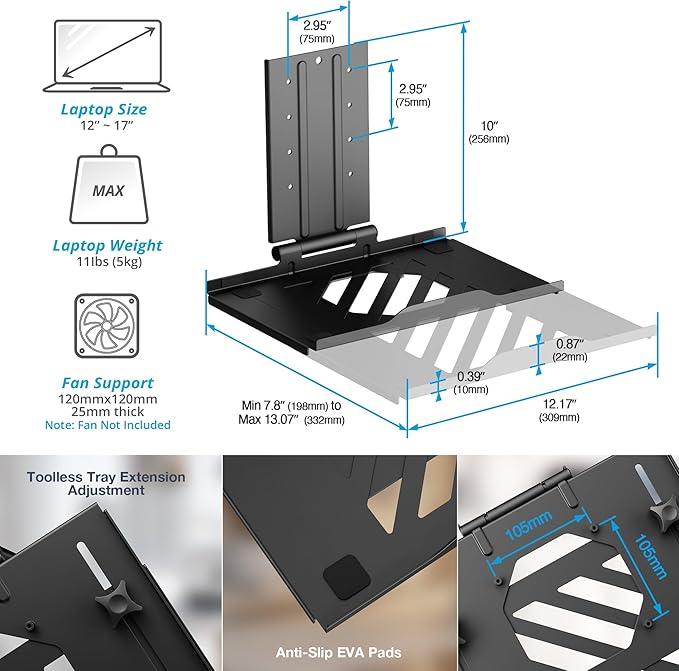 - Laptop Tray With Fan Mount: Use as a dual monitor setup or monitor plus laptop configuration; tray accommodates laptops or tablets and includes fan mount option (fan not included).