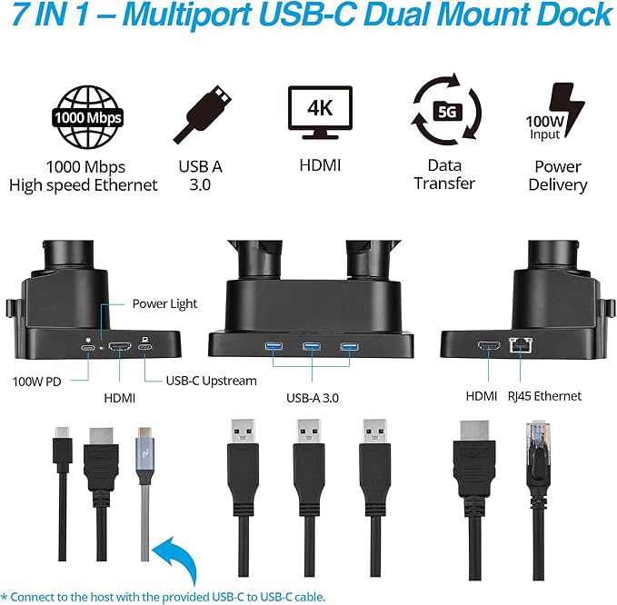 - 7-in-1 Docking Station Base: Integrated base includes 3 USB-A 3.0 ports (5 Gbps), 2 HDMI ports (MST), 1 RJ45 Ethernet port (1 Gbps), and 1 USB-C 100W PD input; requires full-function USB-C 3.1 Gen 2 port or above.