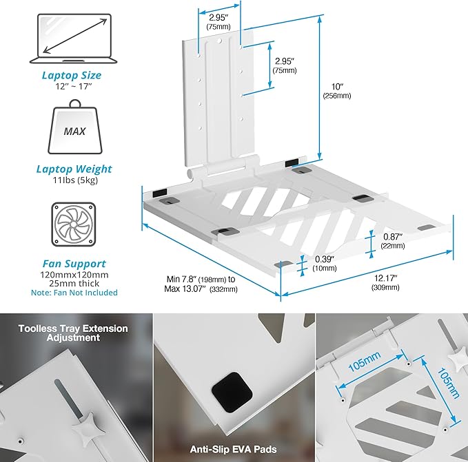 - Laptop Tray With Fan Mount: Use as a dual monitor setup or monitor plus laptop configuration; tray accommodates laptops or tablets and includes fan mount option (fan not included).