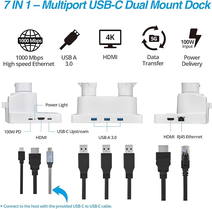 - 7-in-1 Docking Station Base: Integrated base includes 3 USB-A 3.0 ports (5 Gbps), 2 HDMI ports (MST), 1 RJ45 Ethernet port (1 Gbps), and 1 USB-C 100W PD input; requires full-function USB-C 3.1 Gen 2 port or above.