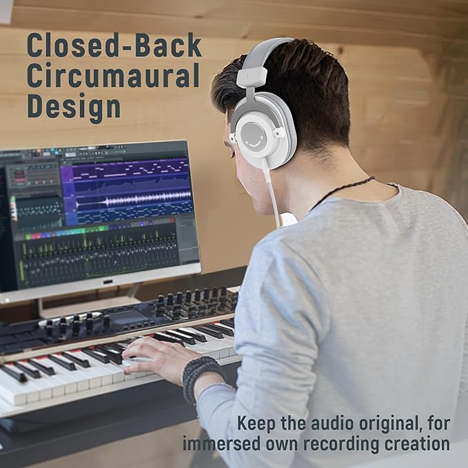- [Comfortable Ear-Cups Design] The white over-ear headphones are made of soft leather material that ensures a pleasant long-time wearing experience without stuffiness. Flexible foldable headbands of monitor headphones adopt a portable design, which can help you adjust comfy position easily.