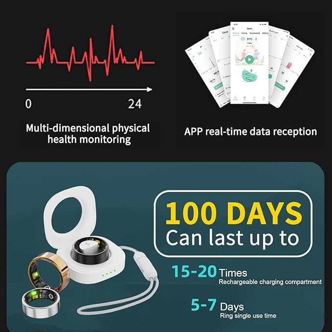 - 【Long Battery Life】After Sleep Ring is fully charged, it can be used continuously for up to 5-7 days, Paired with free 300mAh mini charging case, Fitness Tracker Ring can provide 10-15 cycles of charging for the ring, and there is no need to worry about electricity frequently
