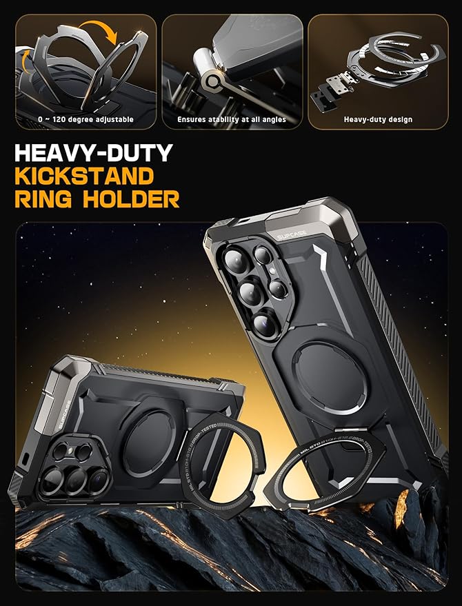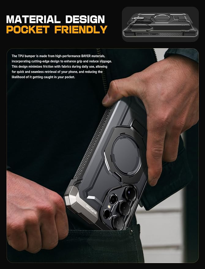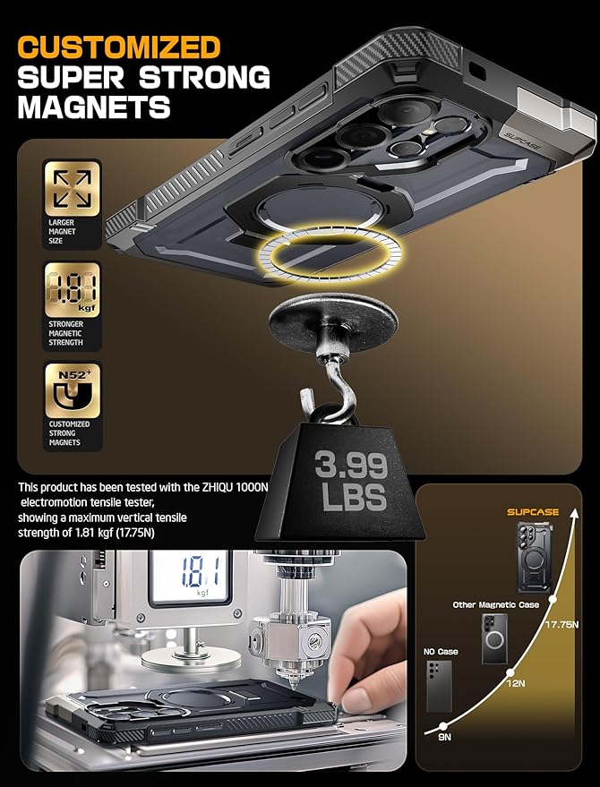 - Built-in aluminum alloy kickstand offers multiple viewing angles. Equipped with an N52 powerful magnet, delivering a magnetic force of up to 1500g ensuring seamless compatibility with MagSafe accessories (magnetic car mount, MagSafe wireless charger, magnetic card holder, desktop magnetic wireless charging stand).