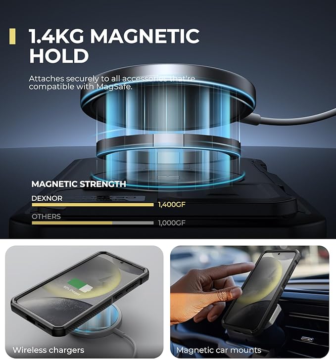 - Secure magnetic attachment: With a magnetic hold of up to 1,400g, this rugged case attaches seamlessly to all magnetic-compatible accessories. Whether it's a wireless charger or a magnetic car mount, it keeps your phone securely in place no matter the situation.