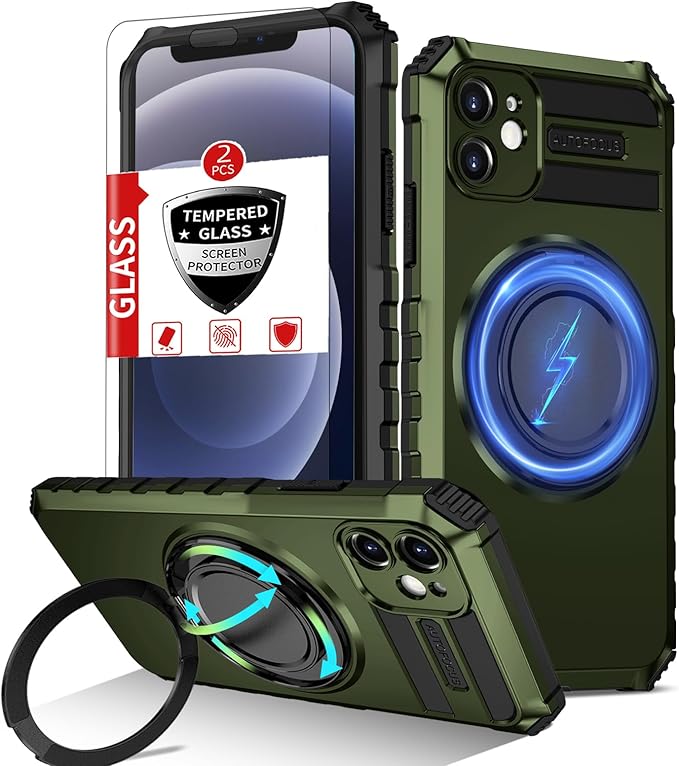 Magnetic for iPhone 12 Case Compatible with MagSafe Wireless Charging,12 Phone Case with 2 Screen Protectors,Built-in Kickstand Ring Military Grade Drop Shockproof Heavy Duty Protection Green